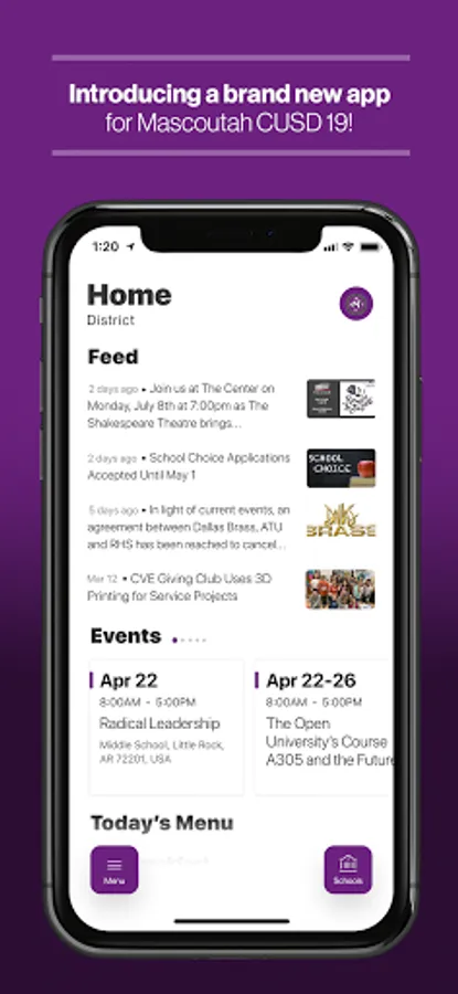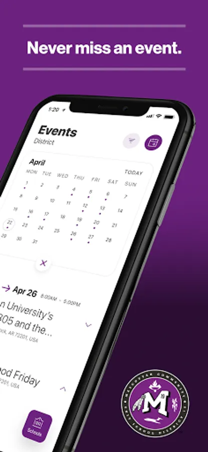 The event section shows a list of events throughout the district. Users can add an event to your calendar to share the event with friends and family with one tap.
