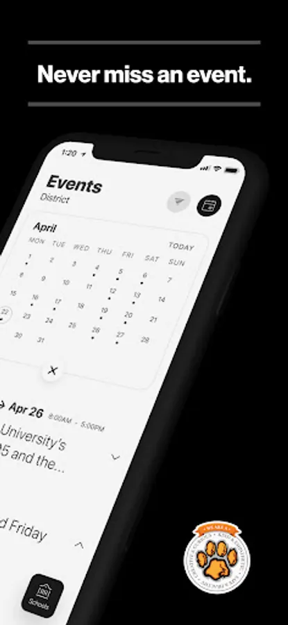 The event section shows a list of events throughout the district. Users can add an event to your calendar to share the event with friends and family with one tap.