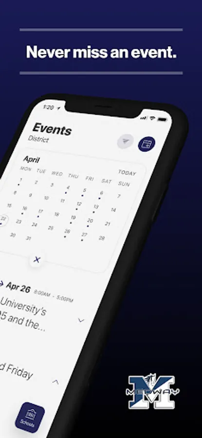 The event section shows a list of events throughout the district. Users can add an event to their calendar to share the event with friends and family with one tap.