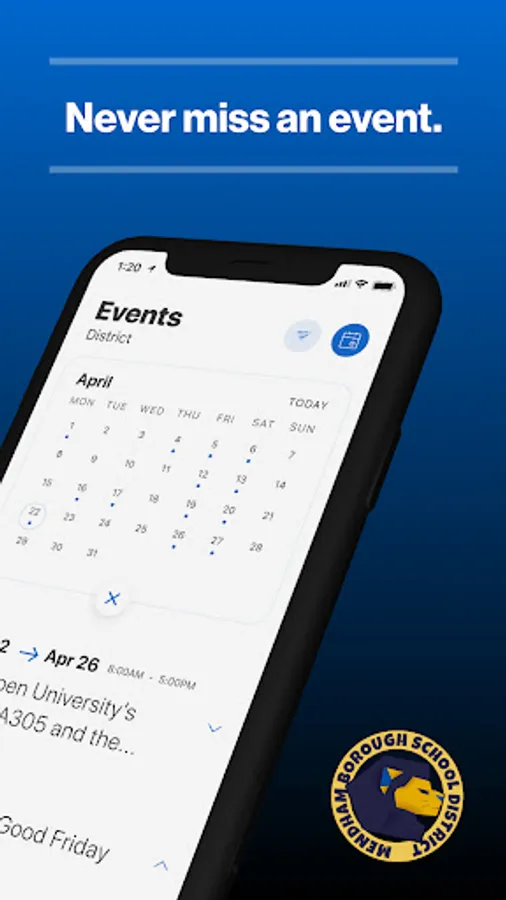 The event section shows a list of events throughout the district. Users can add an event to their calendar to share the event with friends and family with one tap.