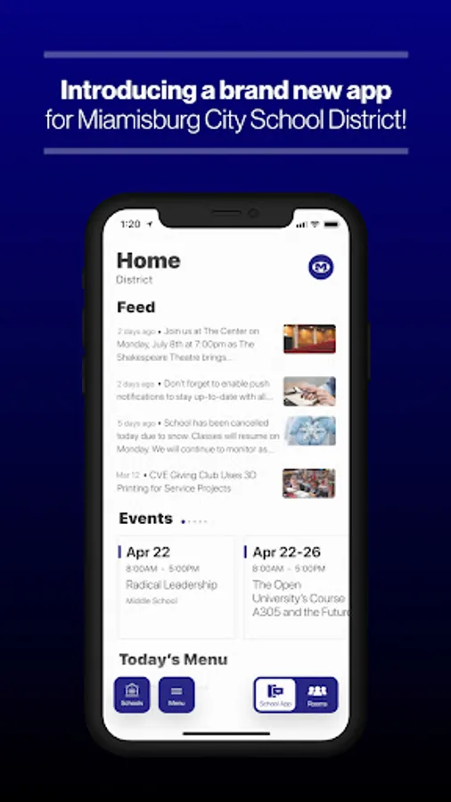 The event section shows a list of events throughout the district. Users can add an event to their calendar to share the event with friends and family with one tap.