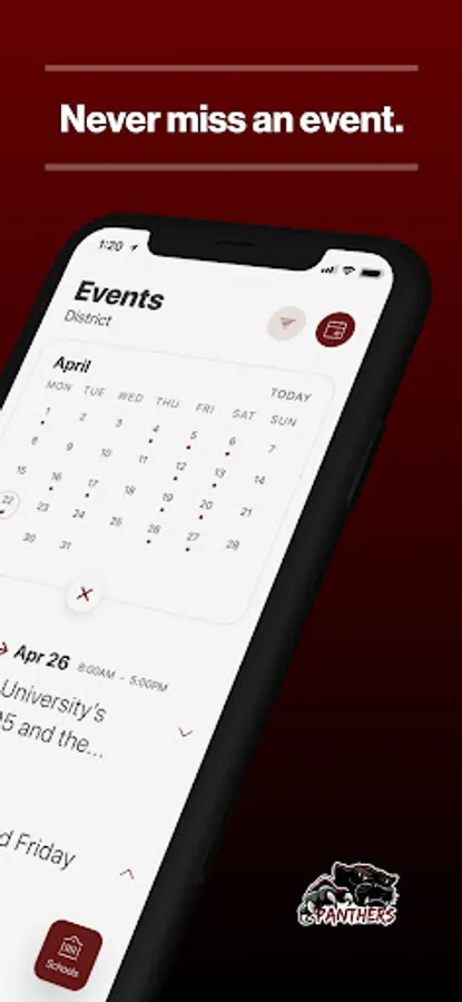 The event section shows a list of events throughout the district. Users can add an event to your calendar to share the event with friends and family with one tap.