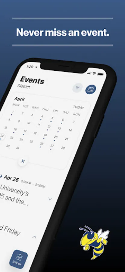 The event section shows a list of events throughout the district. Users can add an event to your calendar to share the event with friends and family with one tap.