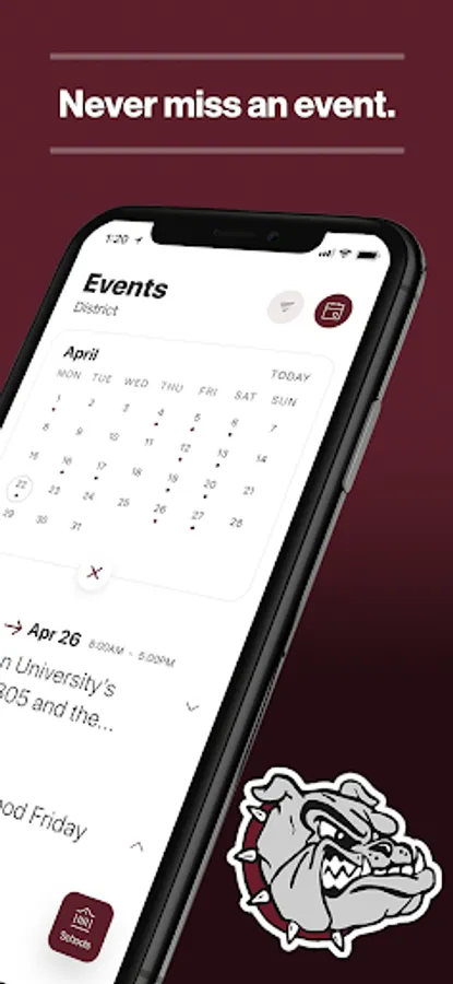 The event section shows a list of events throughout the district. Users can add an event to their calendar to share the event with friends and family with one tap.