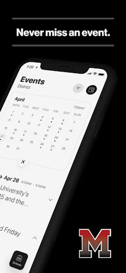 The event section shows a list of events throughout the district. Users can add an event to their calendar to share the event with friends and family with one tap.