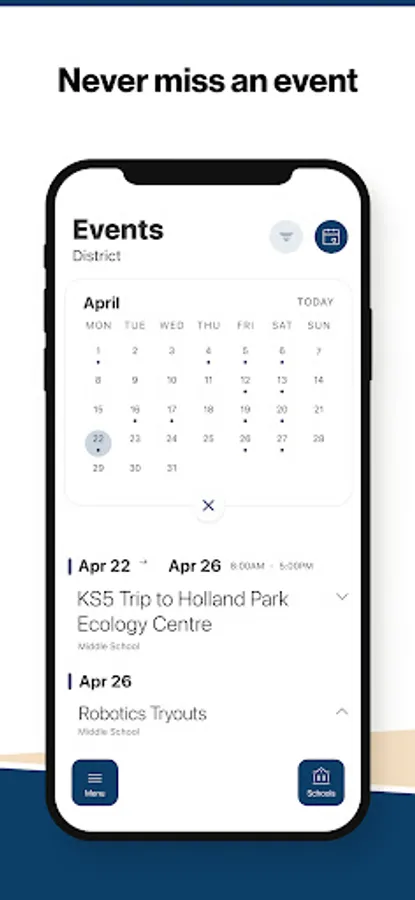 The event section shows a list of events throughout the district. Users can add an event to their calendar to share the event with friends and family with one tap.