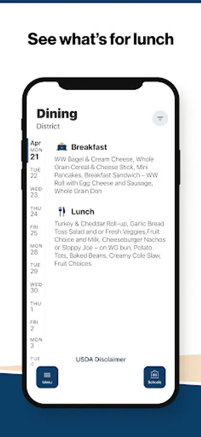 Within the dining section, you’ll find an easy to navigate, weekly menu, sorted by day and meal type.