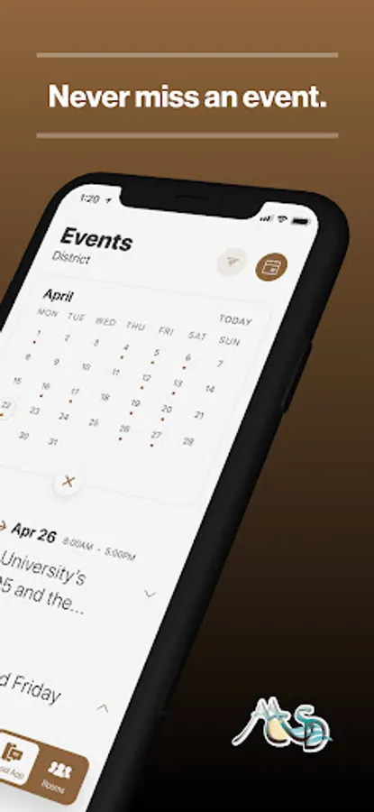The event section shows a list of events throughout the district. Users can add an event to their calendar to share the event with friends and family with one tap.