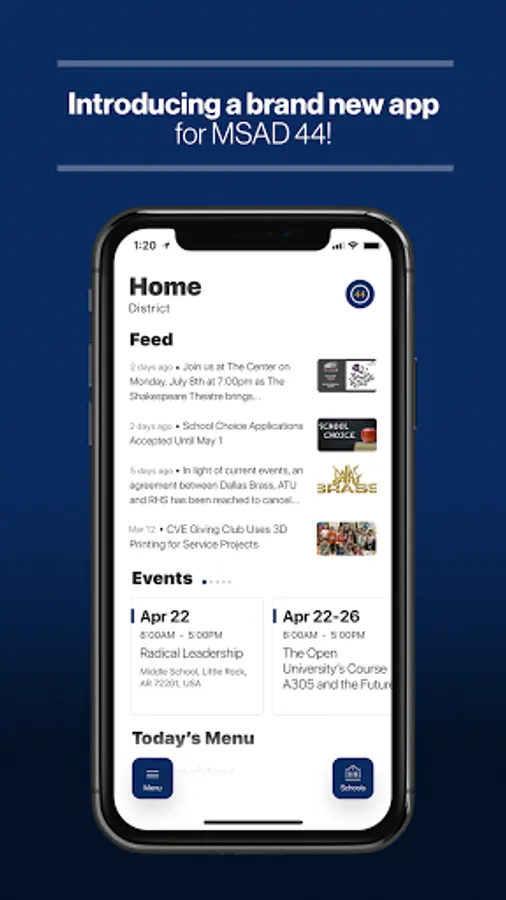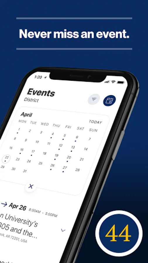 The event section shows a list of events throughout the district. Users can add an event to their calendar to share the event with friends and family with one tap.