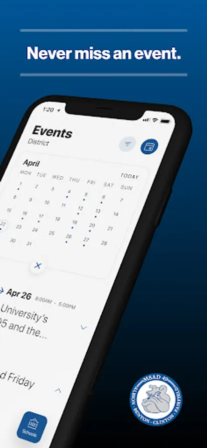 The event section shows a list of events throughout the district. Users can add an event to your calendar to share the event with friends and family with one tap.