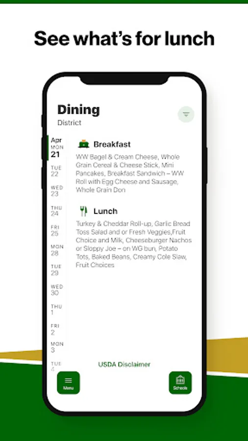 Within the dining section, you'll find an easy to navigate, weekly menu, sorted by day and meal type.