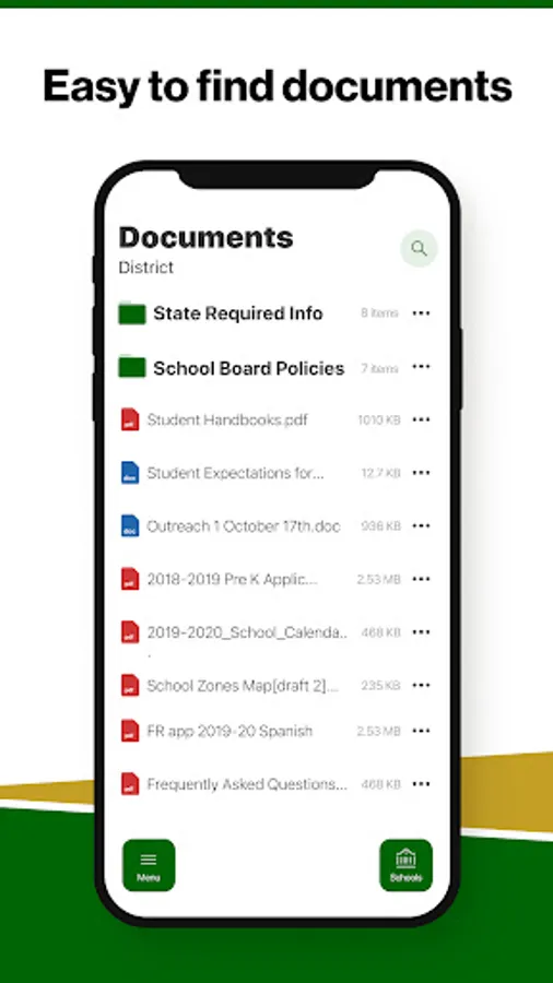 The event section shows a list of events throughout the district. Users can add an event to their calendar to share the event with friends and family with one tap.