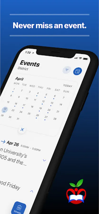 The event section shows a list of events throughout the district. Users can add an event to your calendar to share the event with friends and family with one tap.