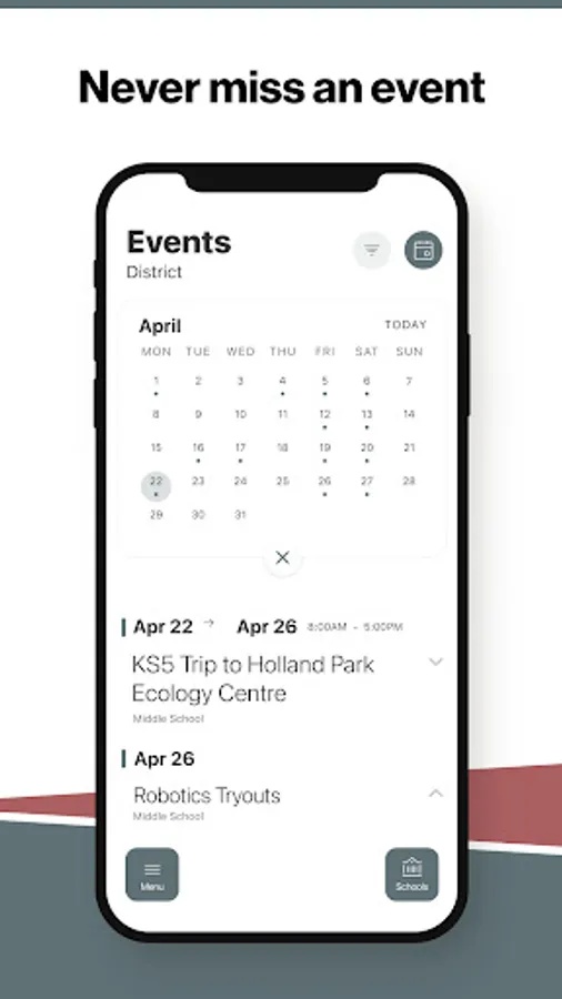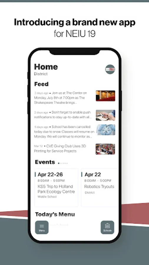 The event section shows a list of events throughout the district. Users can add an event to their calendar to share the event with friends and family with one tap.