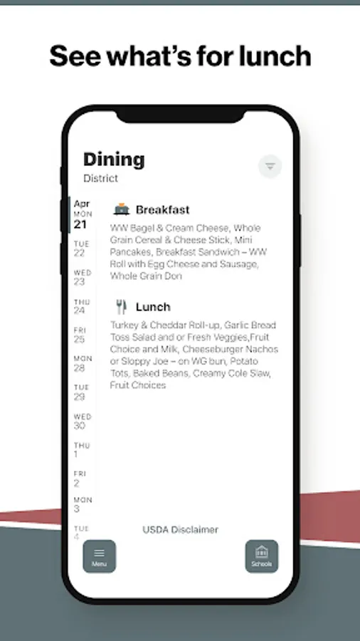Within the dining section, you'll find an easy to navigate, weekly menu, sorted by day and meal type.