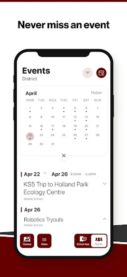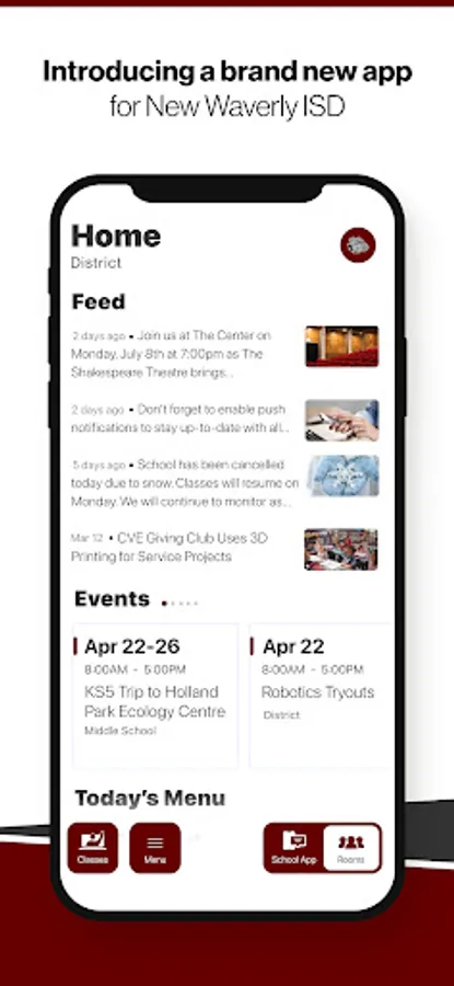 The event section shows a list of events throughout the district. Users can add an event to your calendar to share the event with friends and family with one tap.