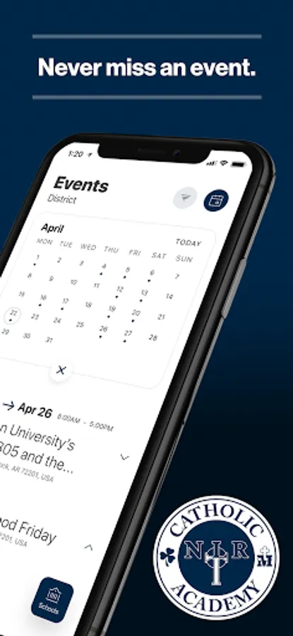 The event section shows a list of events throughout the district. Users can add an event to your calendar to share the event with friends and family with one tap.