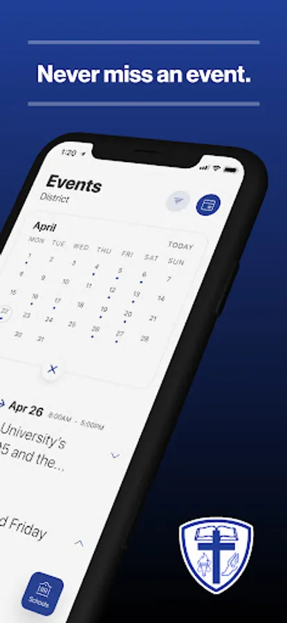 The event section shows a list of events throughout the district. Users can add an event to their calendar to share the event with friends and family with one tap.