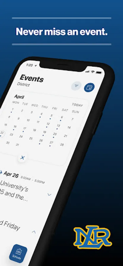 The event section shows a list of events throughout the district. Users can add an event to their calendar to share the event with friends and family with one tap.