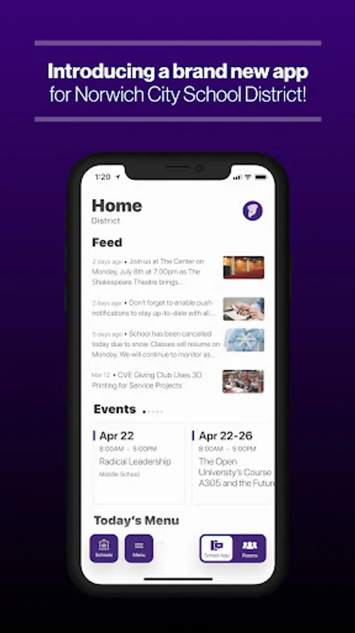The event section shows a list of events throughout the district. Users can add an event to their calendar to share the event with friends and family with one tap.