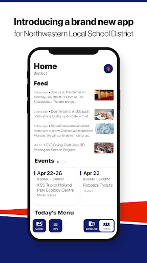 The event section shows a list of events throughout the district. Users can add an event to your calendar to share the event with friends and family with one tap.