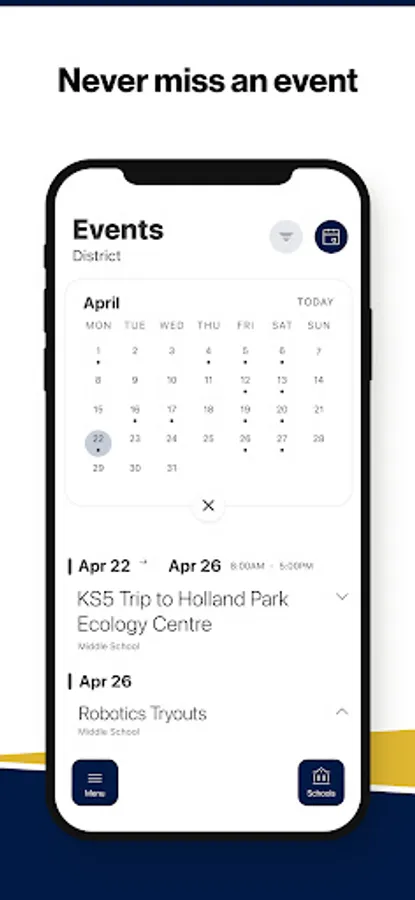 The event section shows a list of events throughout the district. Users can add an event to their calendar to share the event with friends and family with one tap.