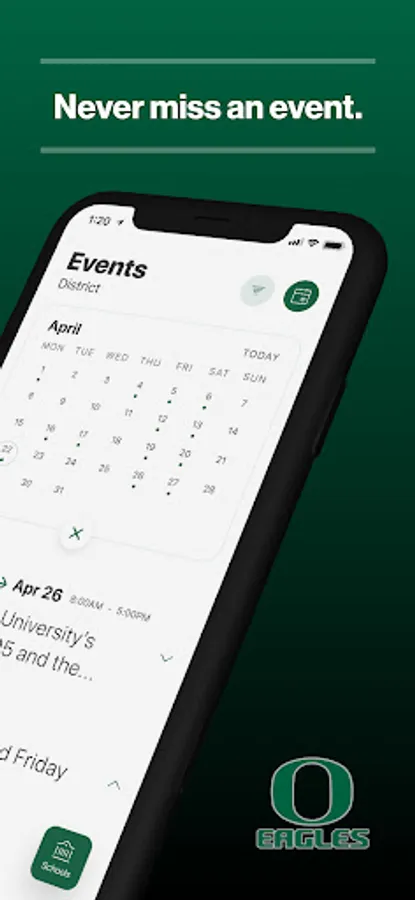 The event section shows a list of events throughout the district. Users can add an event to their calendar to share the event with friends and family with one tap.