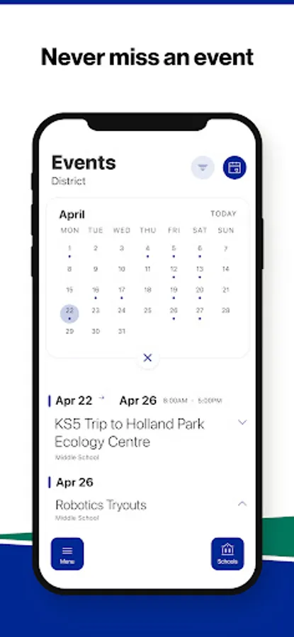 The event section shows a list of events throughout the district. Users can add an event to their calendar to share the event with friends and family with one tap.