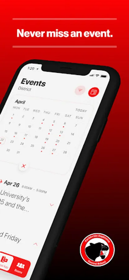The event section shows a list of events throughout the district. Users can add an event to their calendar to share the event with friends and family with one tap.