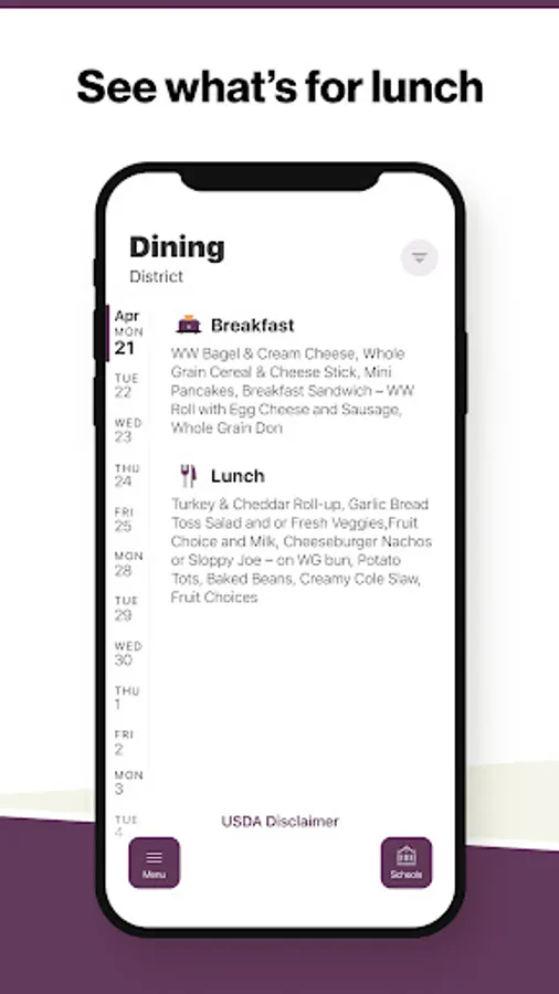 Within the dining section, you'll find an easy to navigate, weekly menu, sorted by day and meal type.