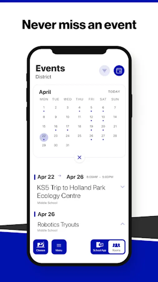 The event section shows a list of events throughout the district. Users can add an event to their calendar to share the event with friends and family with one tap.