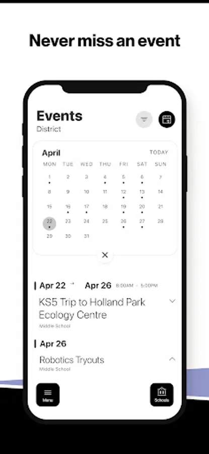 The event section shows a list of events throughout the district. Users can add an event to their calendar to share the event with friends and family with one tap.