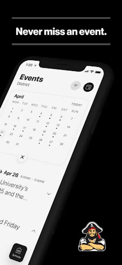The event section shows a list of events throughout the district. Users can add an event to your calendar to share the event with friends and family with one tap.