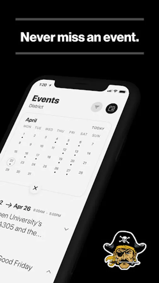 The event section shows a list of events throughout the district. Users can add an event to their calendar to share the event with friends and family with one tap.