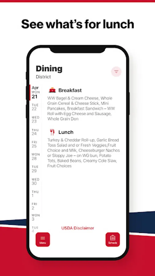Within the dining section, you'll find an easy to navigate, weekly menu, sorted by day and meal type.