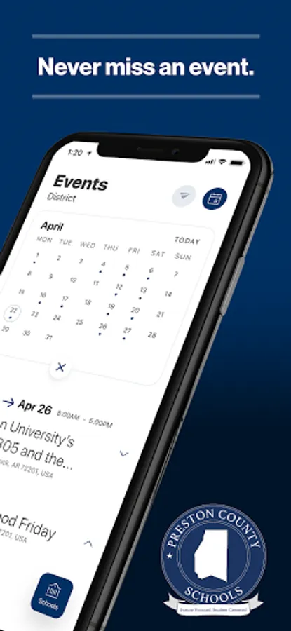 The event section shows a list of events throughout the district. Users can add an event to their calendar to share the event with friends and family with one tap.