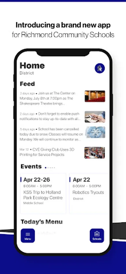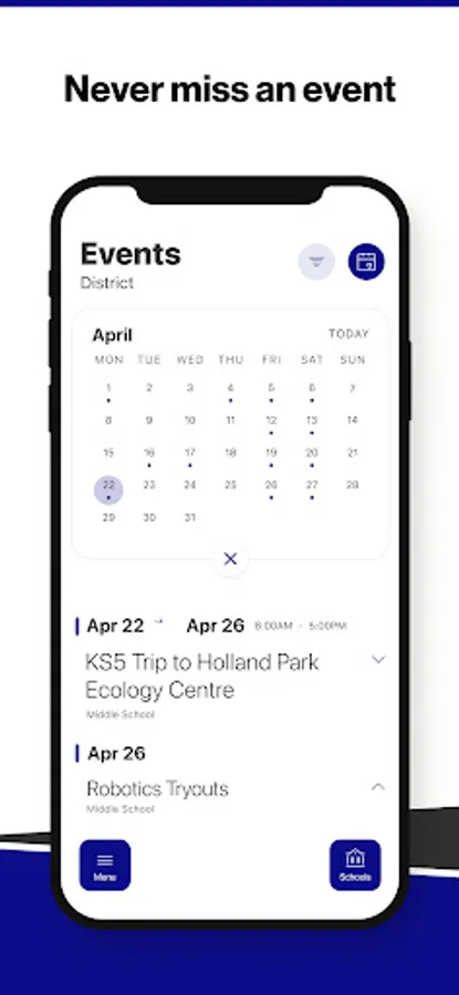 The event section shows a list of events throughout the district. Users can add an event to their calendar to share the event with friends and family with one tap.