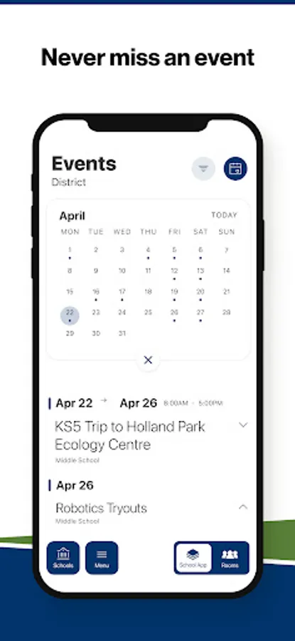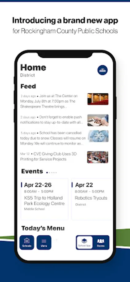 The event section shows a list of events throughout the district. Users can add an event to their calendar to share the event with friends and family with one tap.