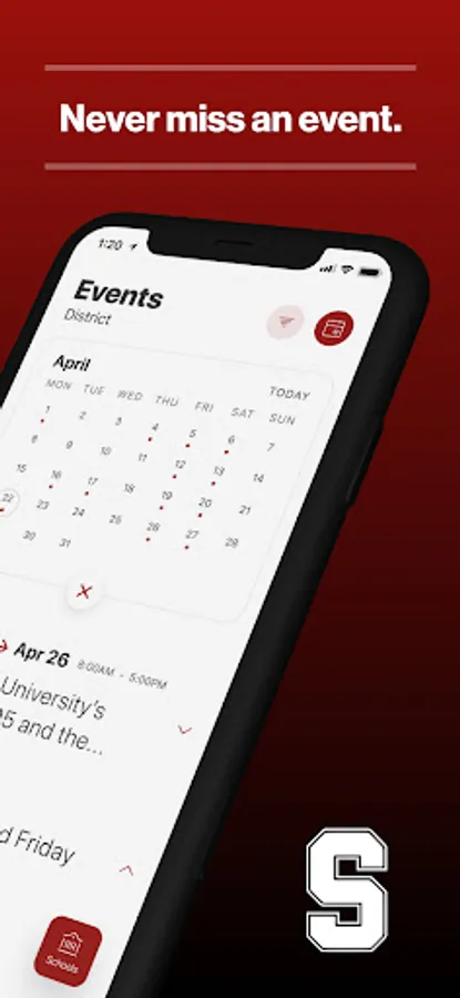 The event section shows a list of events throughout the district. Users can add an event to your calendar to share the event with friends and family with one tap.