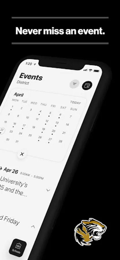 The event section shows a list of events throughout the district. Users can add an event to their calendar to share the event with friends and family with one tap.