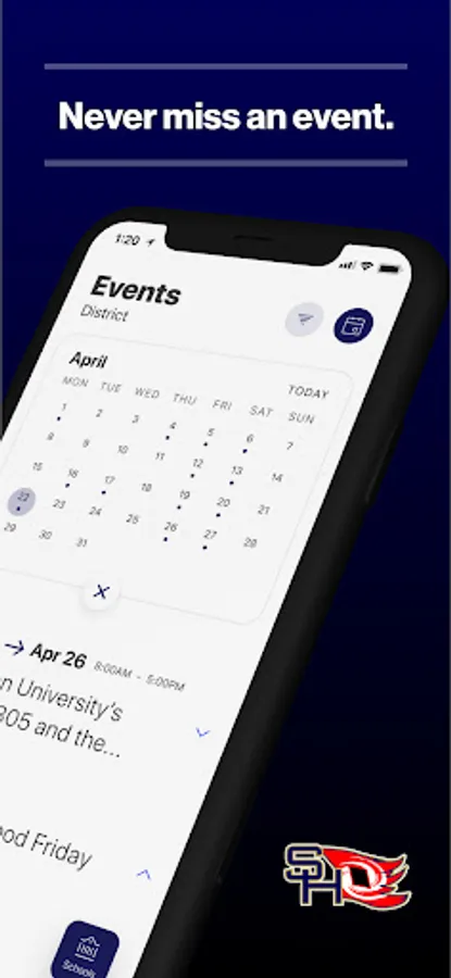 The event section shows a list of events throughout the district. Users can add an event to their calendar to share the event with friends and family with one tap.