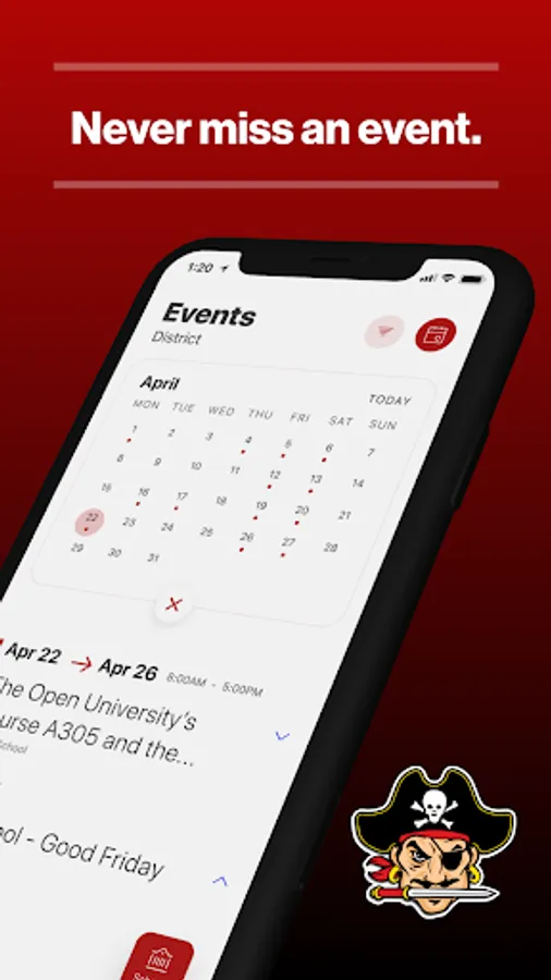 The event section shows a list of events throughout the district. Users can add an event to their calendar to share the event with friends and family with one tap.