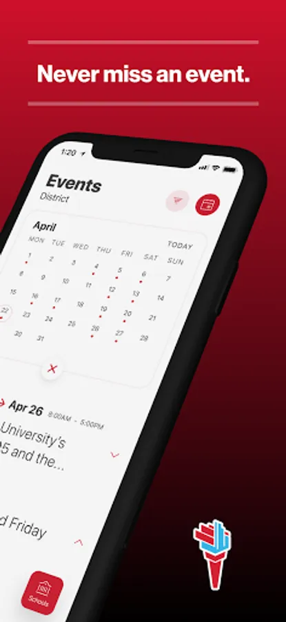 The event section shows a list of events throughout the district. Users can add an event to your calendar to share the event with friends and family with one tap.