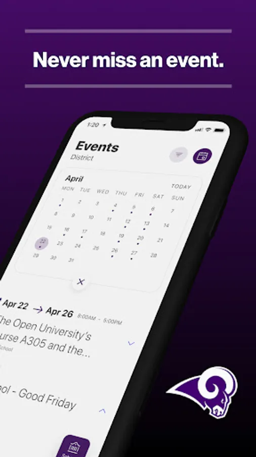 The event section shows a list of events throughout the district. Users can add an event to their calendar to share the event with friends and family with one tap.