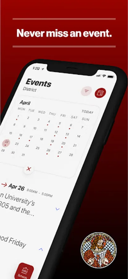The event section shows a list of events throughout the district. Users can add an event to their calendar to share the event with friends and family with one tap.