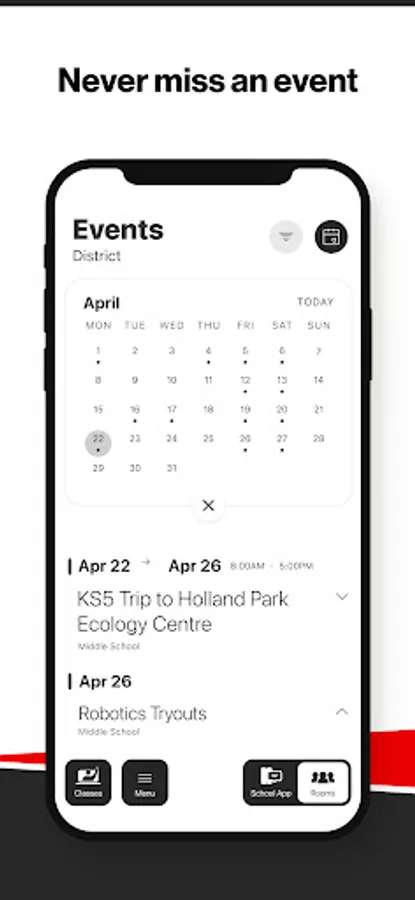 The event section shows a list of events throughout the district. Users can add an event to their calendar to share the event with friends and family with one tap.