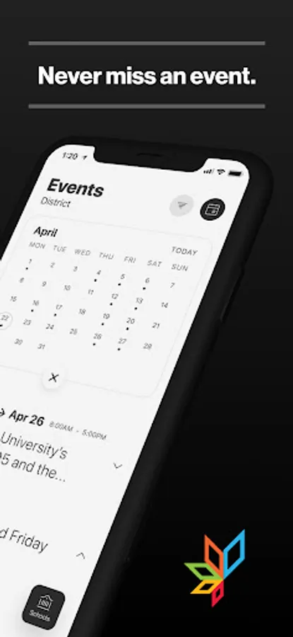 The event section shows a list of events throughout the district. Users can add an event to their calendar to share the event with friends and family with one tap.