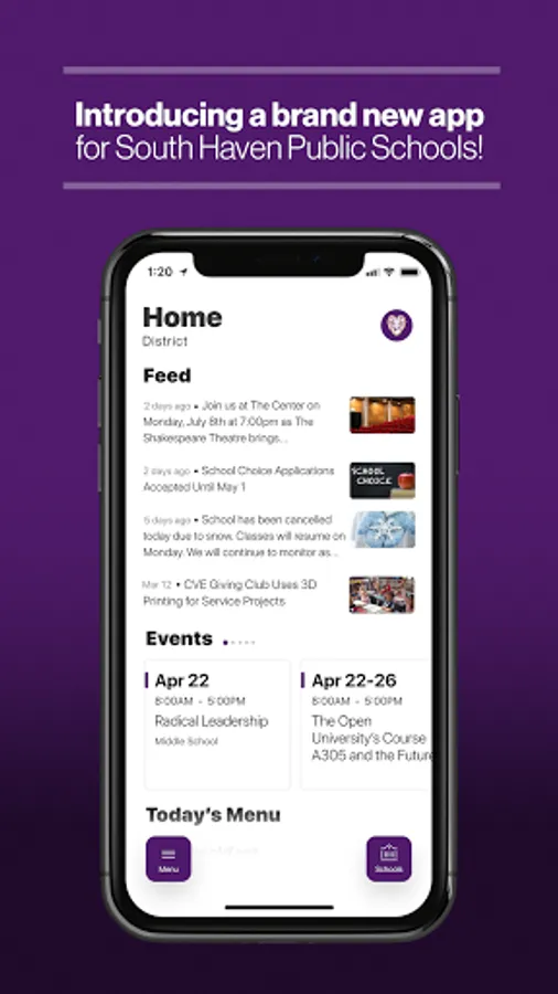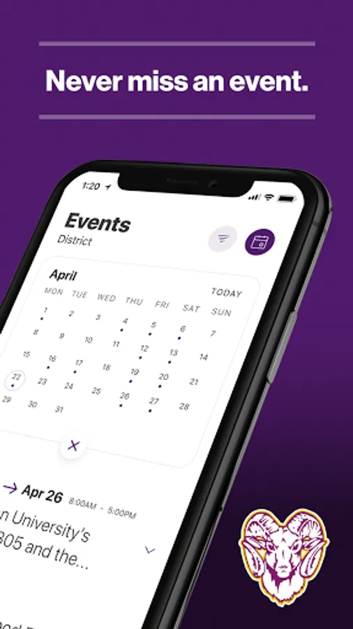 The event section shows a list of events throughout the district. Users can add an event to their calendar to share the event with friends and family with one tap.