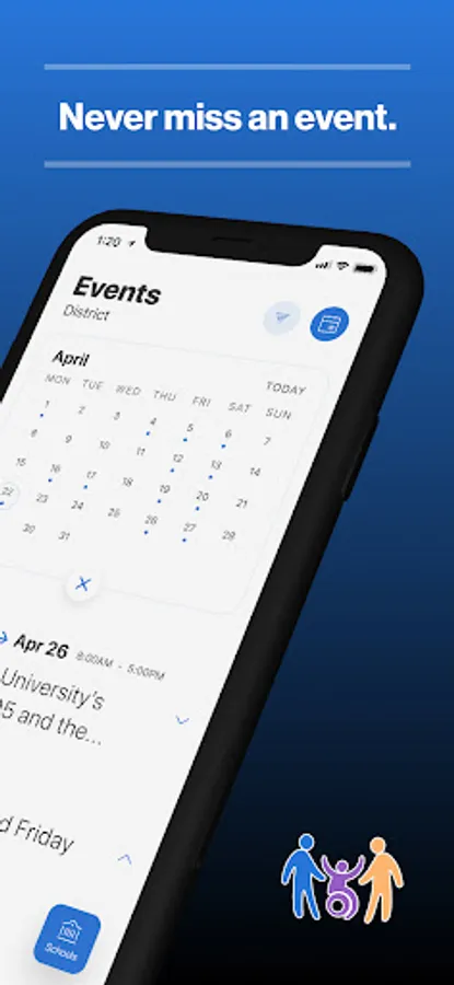 The event section shows a list of events throughout the district. Users can add an event to your calendar to share the event with friends and family with one tap.