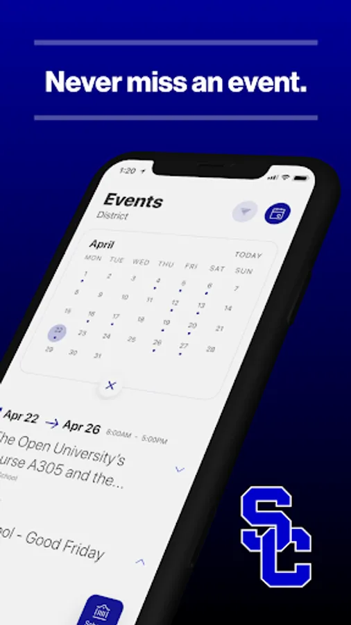 The event section shows a list of events throughout the district. Users can add an event to their calendar to share the event with friends and family with one tap.